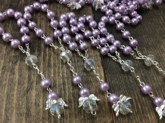 Elegant mini-rosary baptism favors. With attention to details and unmistakable craftsmanship, these mini rosaries come with round smooth glass pearl beads, this rosary comes in white color beads and silver plated chain and wings. Each measuring approximately 3 1/2-4" INCHES in length.