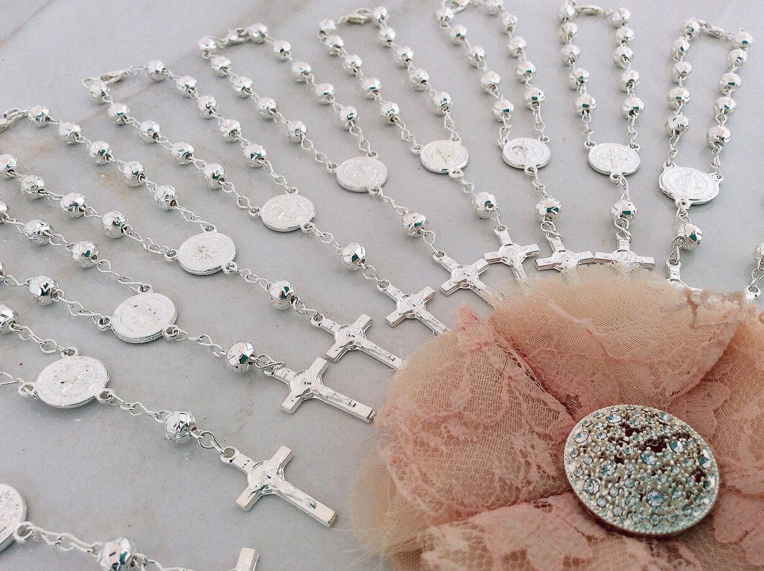 These decade rosaries can be worn as bracelets, or given to your guests as car mirror beads.