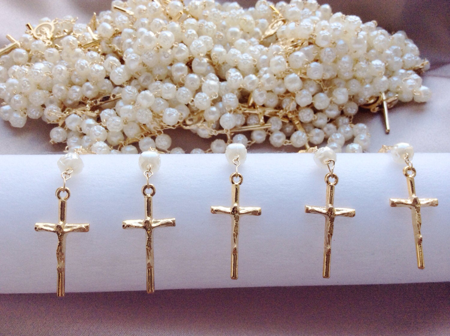 EX. 2nd picture is the "pearl/gold cross", the bead color is pearl-like and the metal finish on the cross and chain is gold.