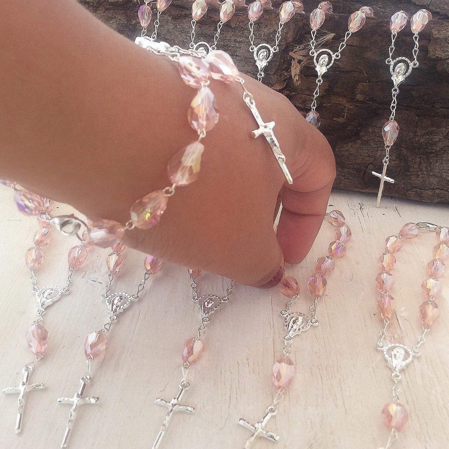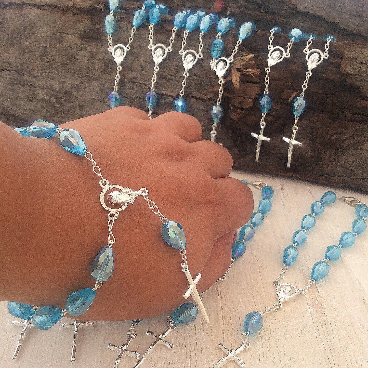 Elegant mini-rosary baptism favors. With attention to details and unmistakable craftsmanship, these mini rosaries are made with fire polished raindrop crystal beads. The beads have a slight ab effect and silver chain and cross.