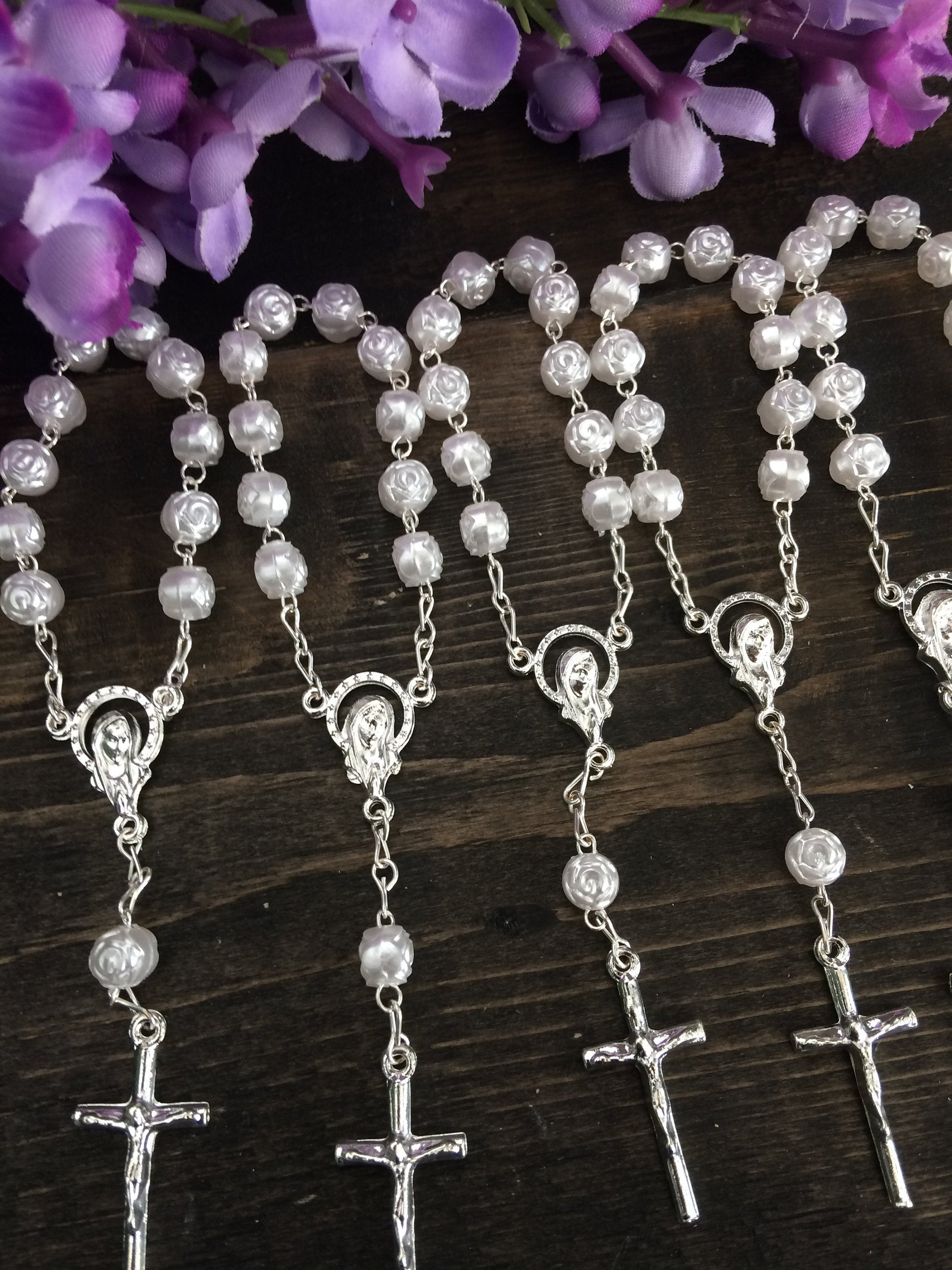 Elegant mini-rosary baptism favors. With attention to details and unmistakable craftsmanship, these mini rosaries come with round beads in the shape of a rose, this rosary comes in pearl color beads and silver plated chain and cross. Each measuring approximately 4 1/4"-4 1/2" INCHES in length.