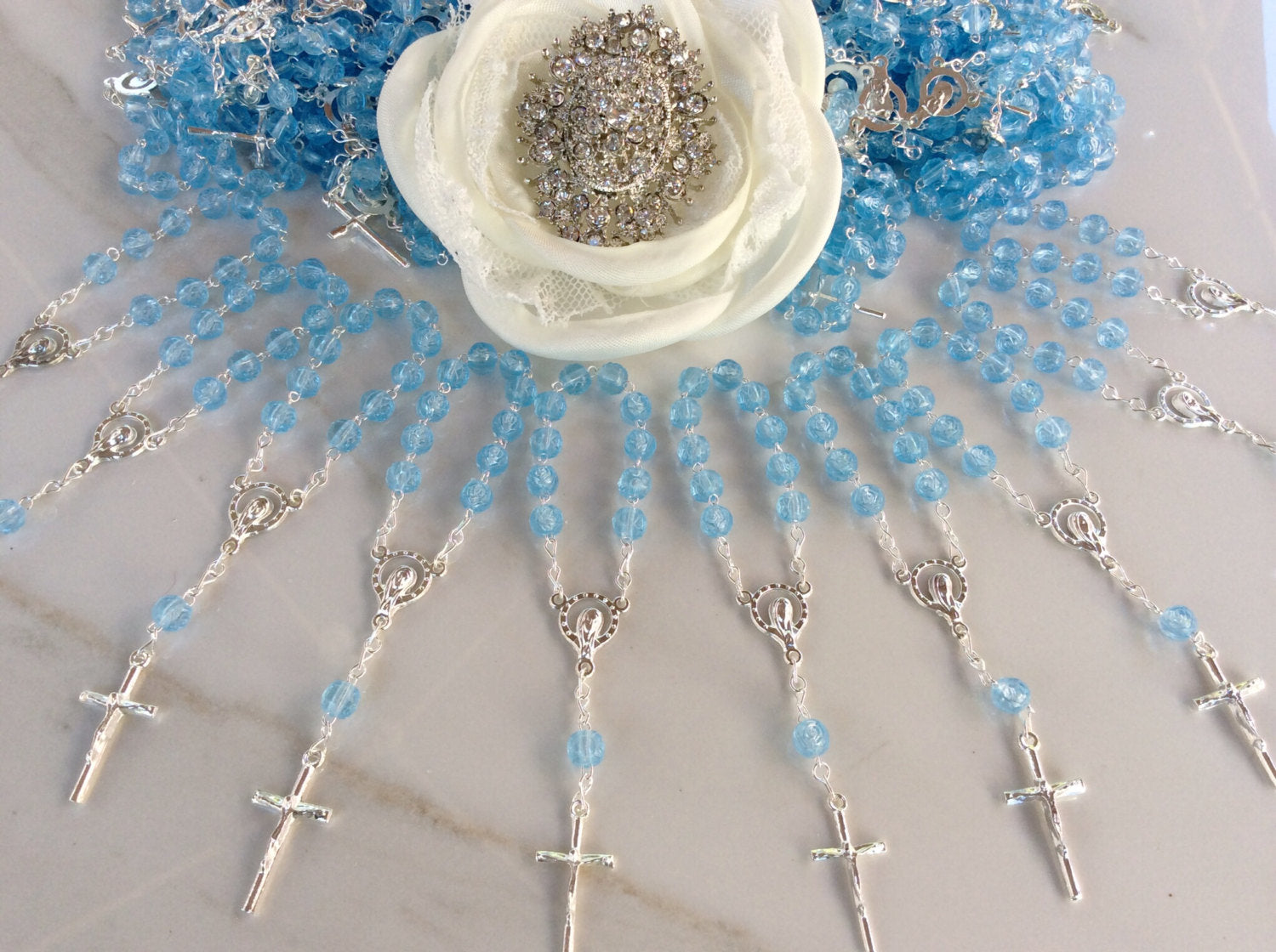 Elegant mini-rosary baptism favors. With attention to details and unmistakable craftsmanship, these mini rosaries come with round acrylic beads, each with the shape of a rose. They measure 4 1/2" INCHES in length.