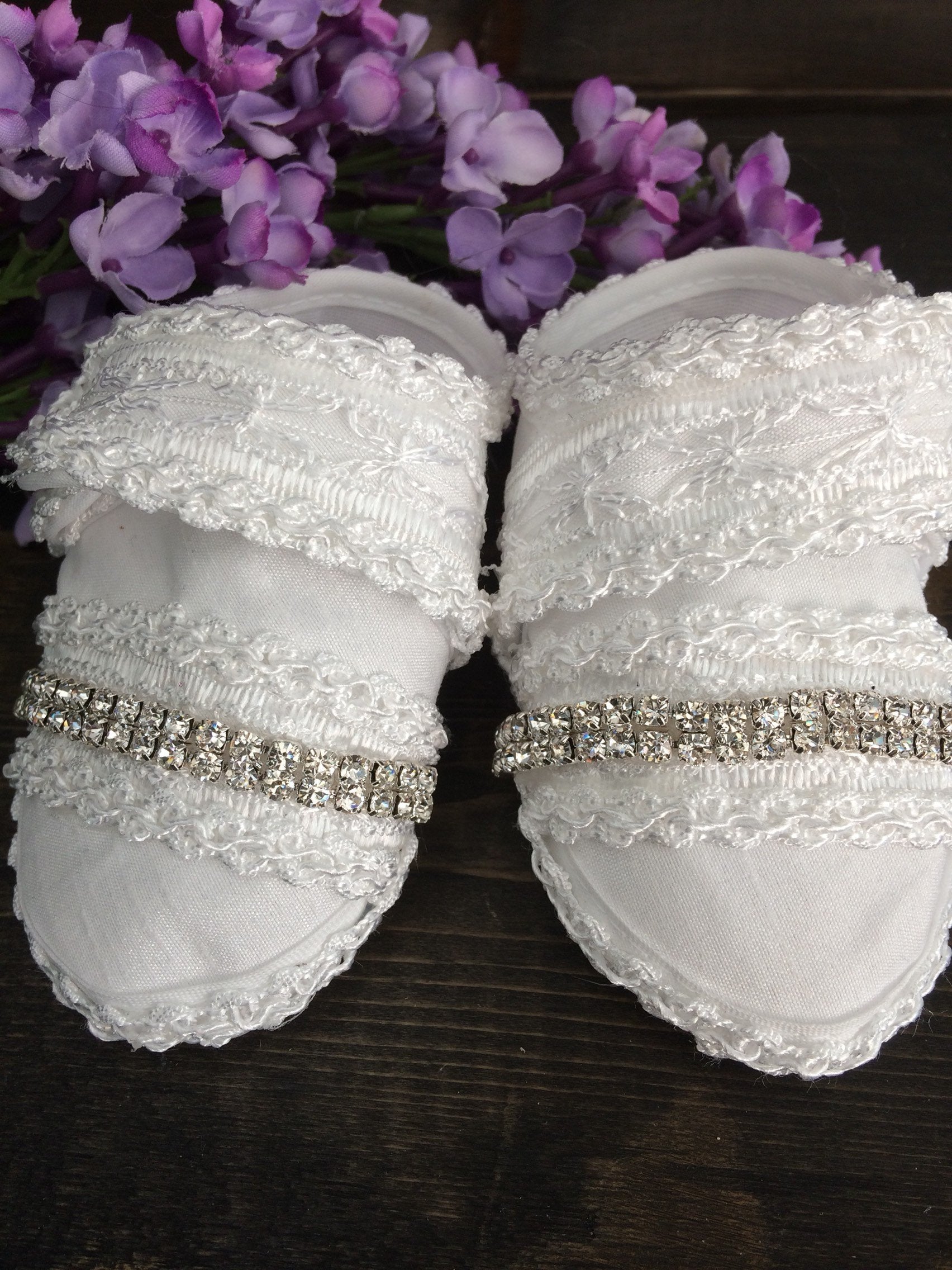 The shoes are made entirely of white shantung silk with a delicate overlay design.