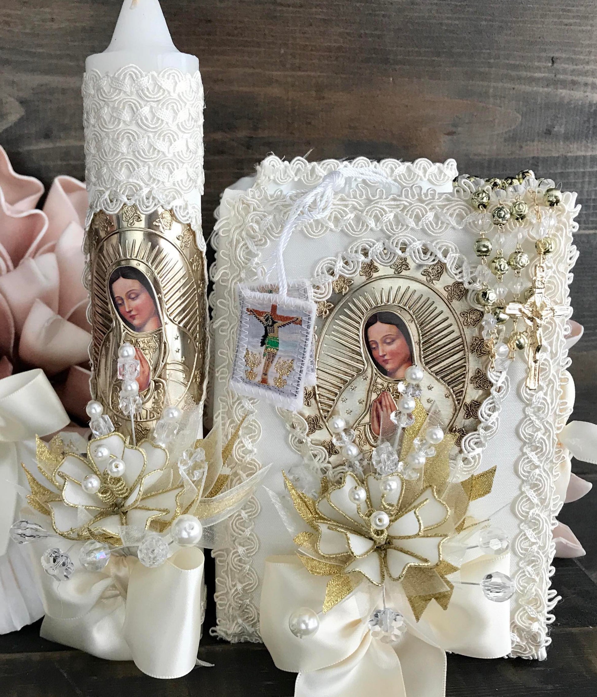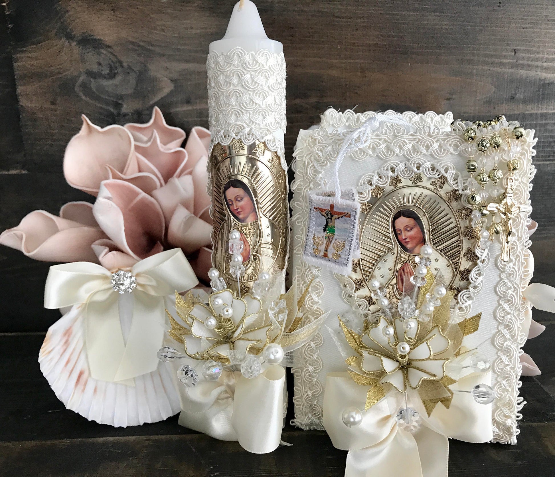 This is an ivory candle set with the image of the gold Virgen de Guadalupe and matching gold rosary. This is a complete set, it includes candle, matching New Testament book, acrylic rosary, scapular, baptismal shell, and small towel.