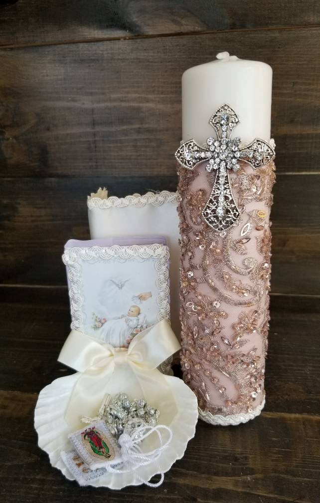 Champagne wrapped baptism candle set. Finished with Ivory trim and ivory lace. finished with rhinestone gold cross