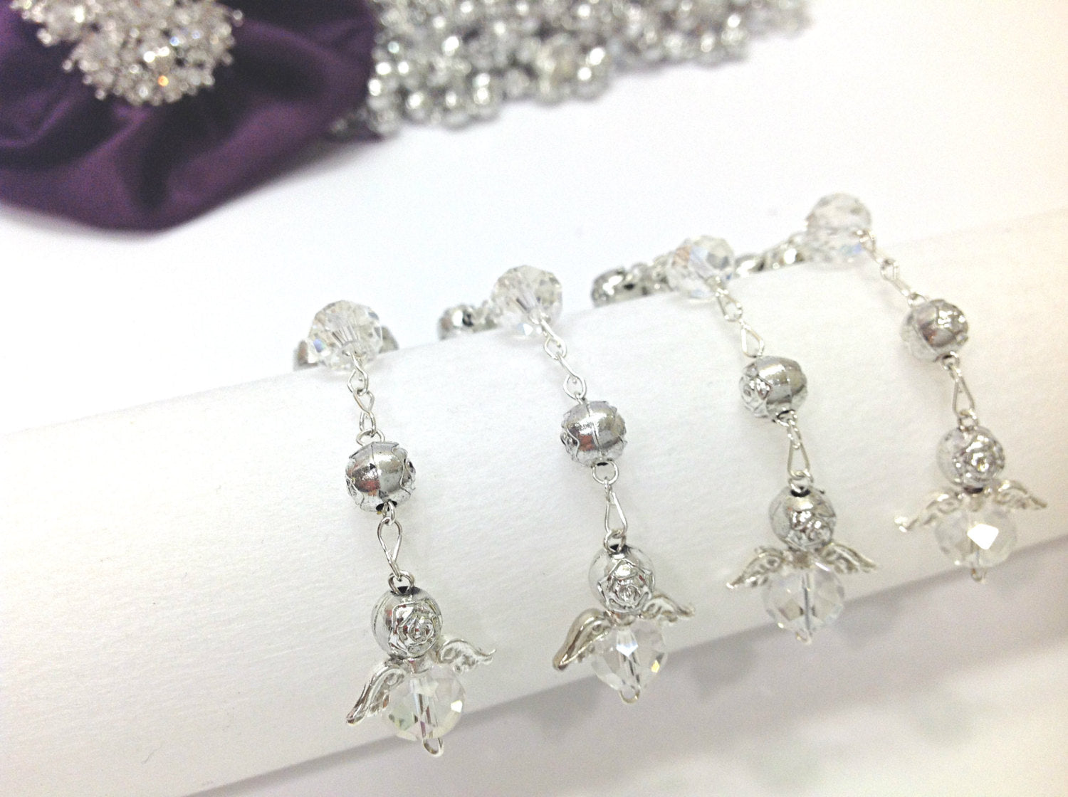 Elegant mini-rosary baptism favors. With attention to details and unmistakable craftsmanship, these mini rosaries come with round beads in the shape of a rose, this rosary comes in clear (slight ab effect) color body and silver plated chain. Uniquely finished with an Angel, made of silver rosebud bead head and large clear (w/ slight ab effect) bottom, with silver wings. Each measuring approximately 4" INCHES in length.