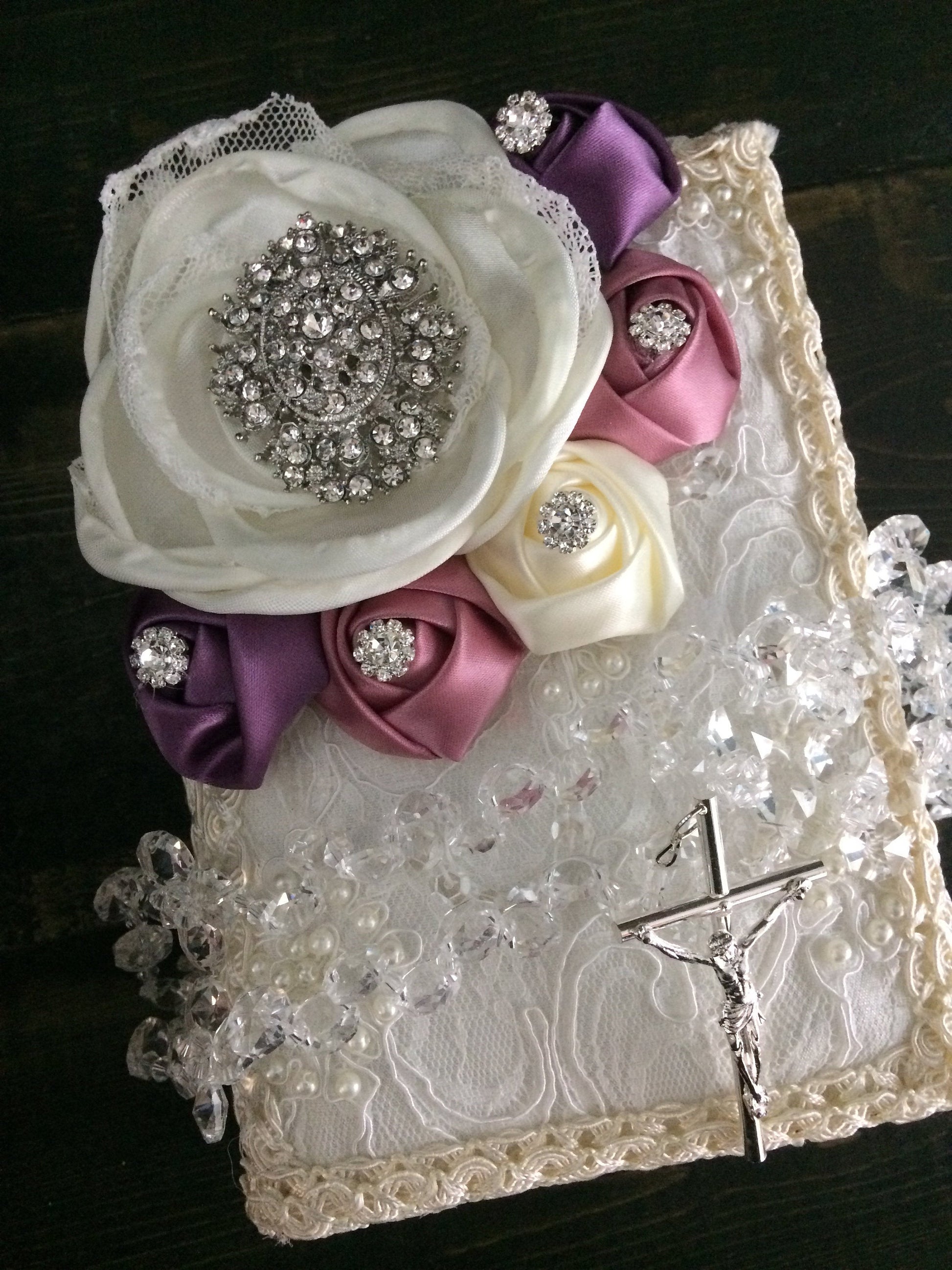 *spanish bible's wrapped in a lace french alencon cloth and detailed with champagne pearls and sequins all around. The book also comes with a matching blush pearls crystal rosary with silver cross.