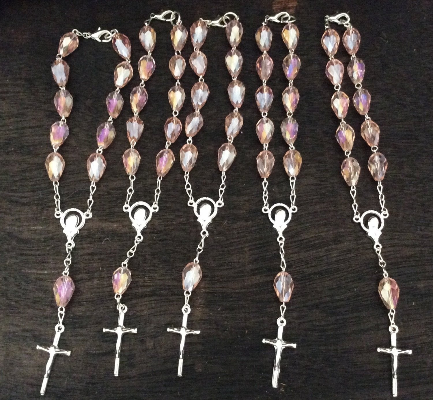 Elegant mini-rosary baptism favors. With attention to details and unmistakable craftsmanship, these mini rosaries are made with fire polished raindrop crystal beads. The beads have a slight ab effect and silver chain and cross.