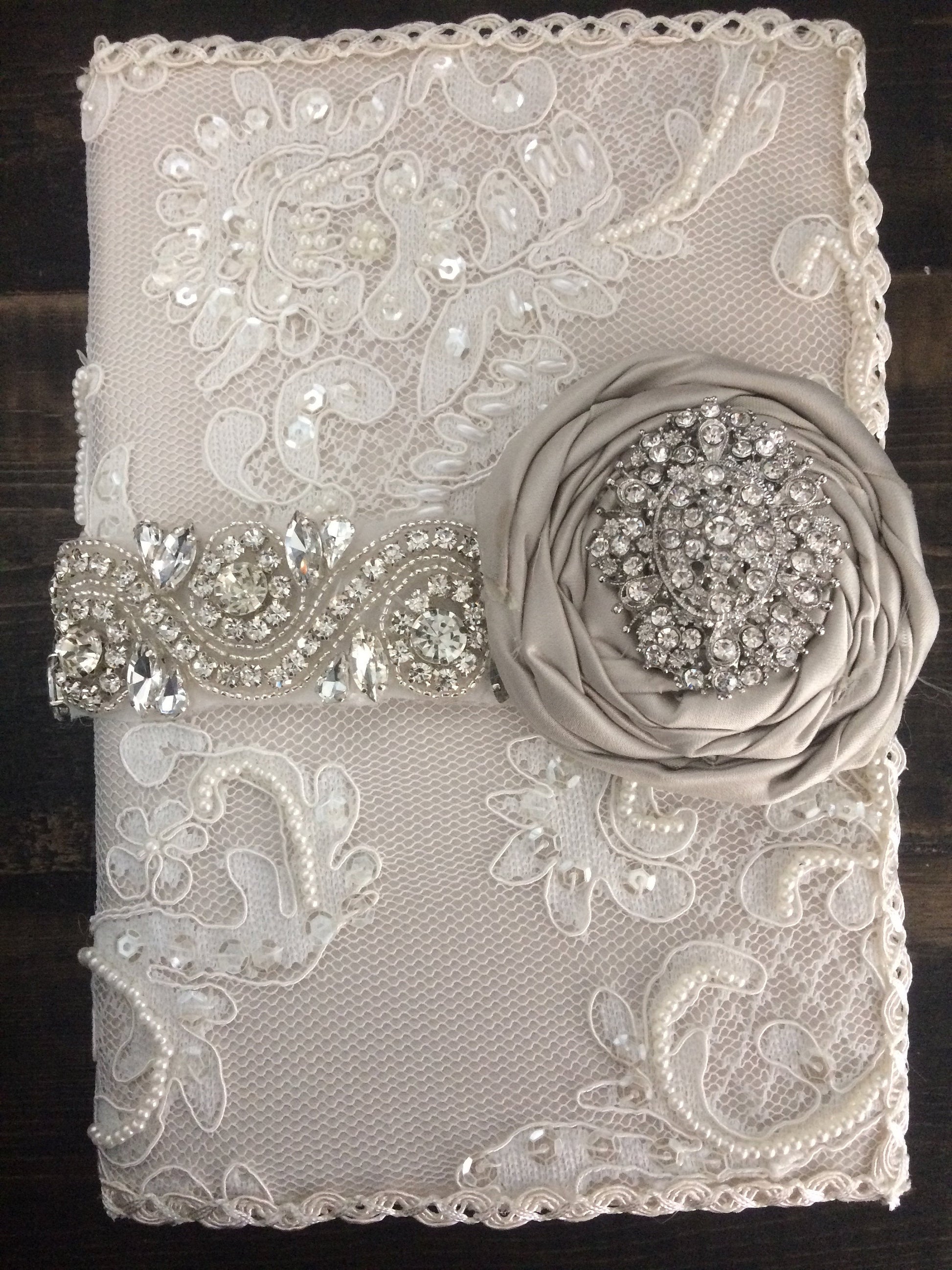 Catholic bible with grey satin and ivory lace, Silver brooch, grey flower and embellishment.