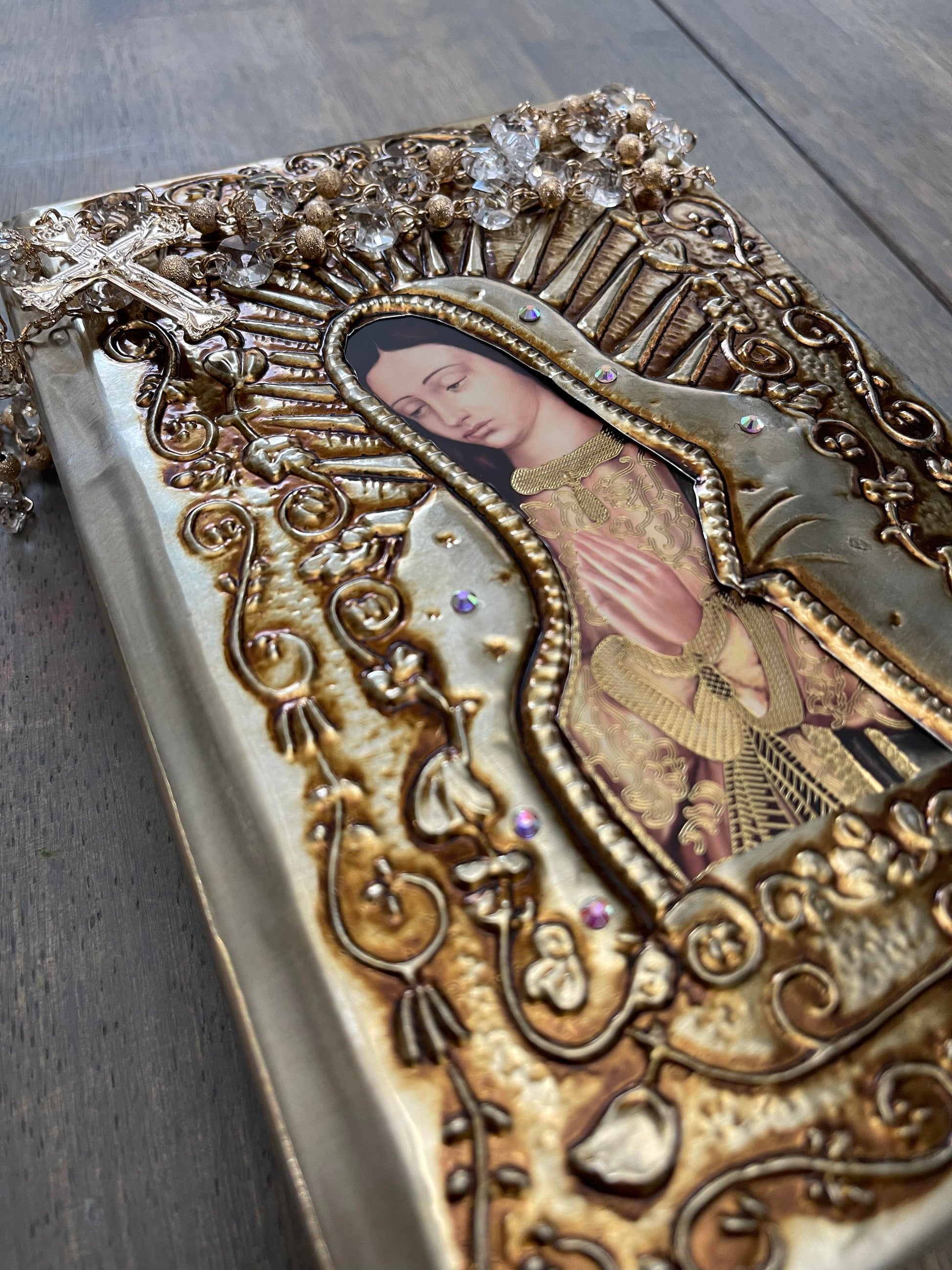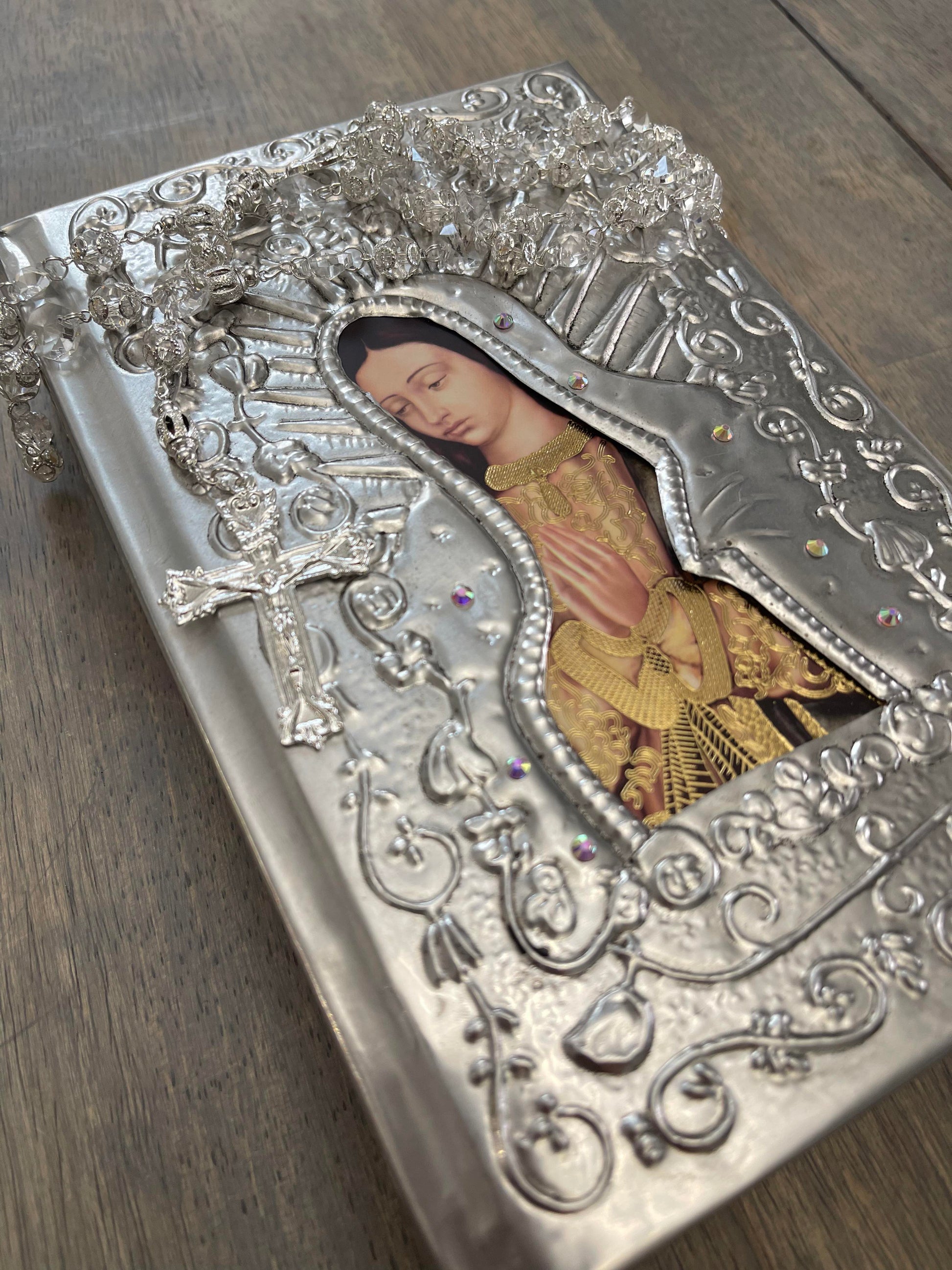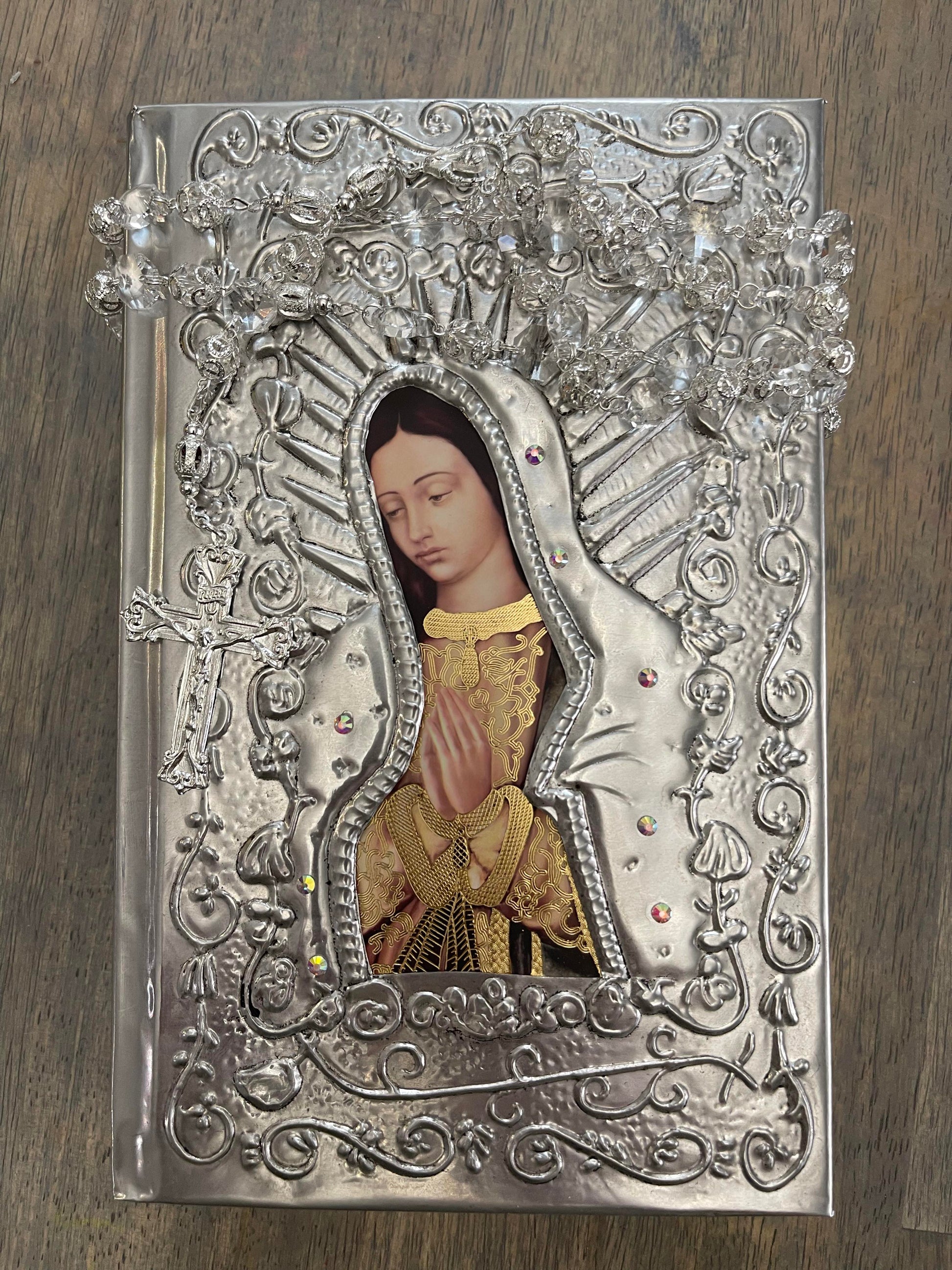 Spanish bible repujado, wedding bible, Quinceañera bible, Biblia de Repujado, embossed metal sheeting bible, Virgen de Guadalupe