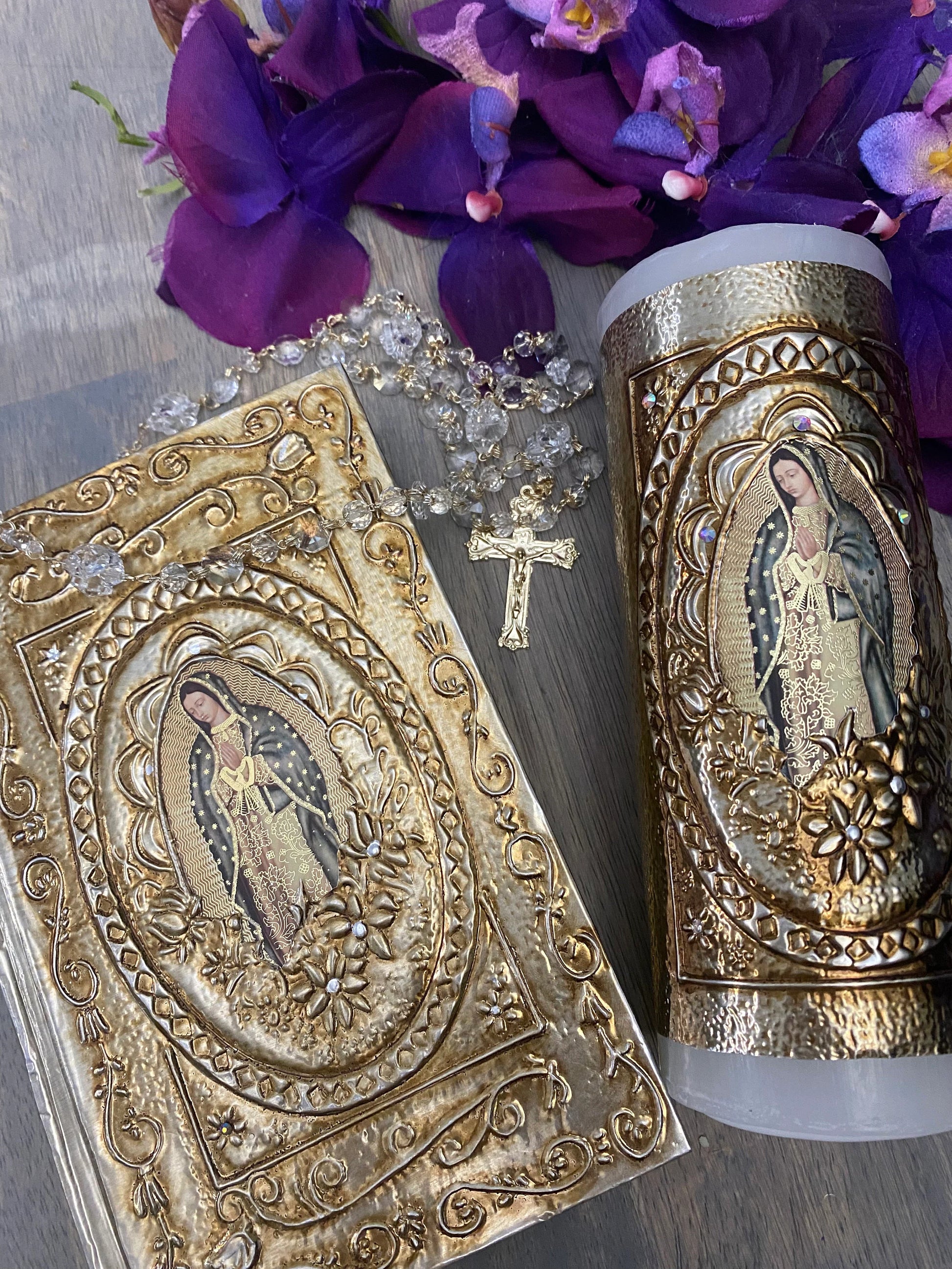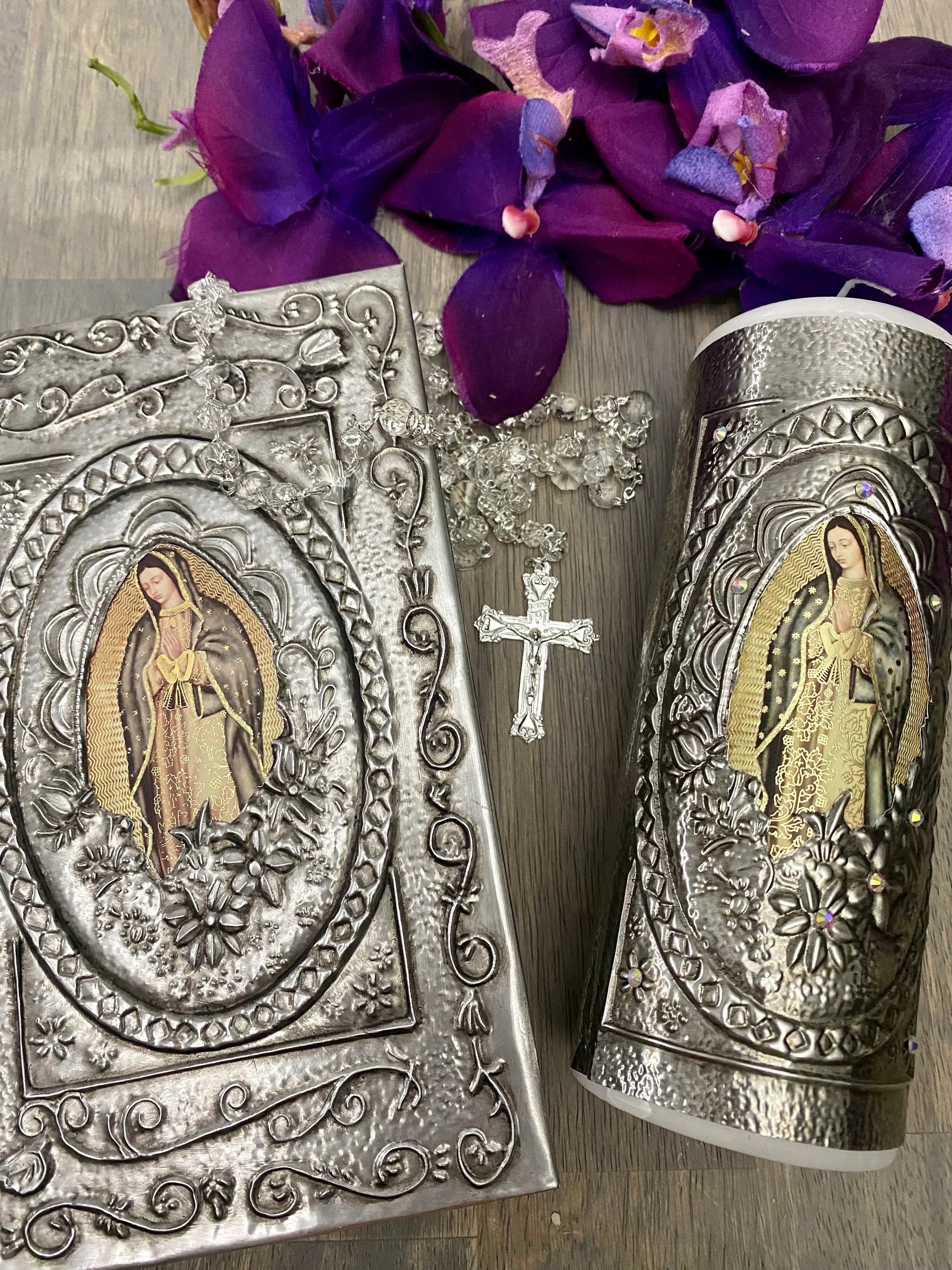 This listing is for a Virgen de Guadalupe, silver and gold, it includes a full size crystal rosary and candle.