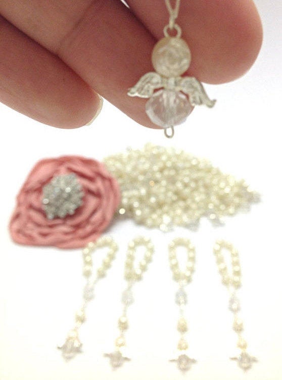 Elegant mini-rosary baptism favors. With attention to details and unmistakable craftsmanship, these mini rosaries come with round beads in the shape of a rose, this rosary comes in pearl color beads and silver plated chain. Uniquely finished with an Angel, made of pearl head and large clear (w/ slight ab effect) bottom, with silver wings. Each measuring approximately 4" INCHES in length.