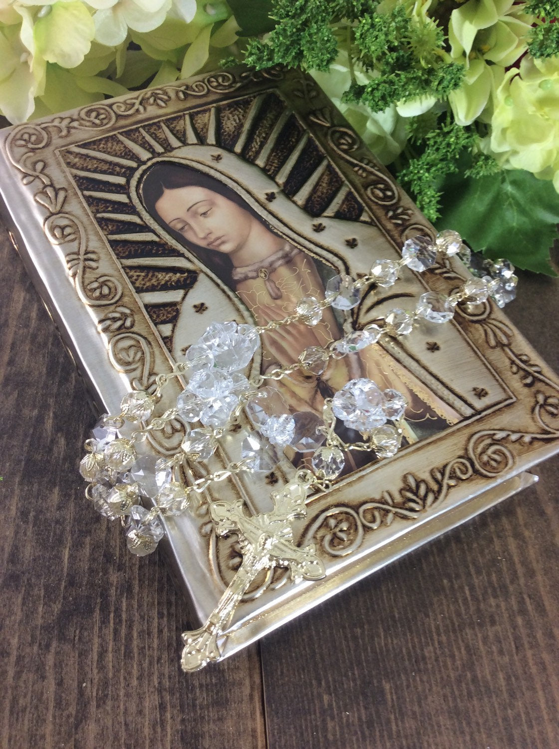 Wedding Gift couple bible wedding bible, Virgen de Guadalupe, our lady of Guadalupe bible,/Embossed plates Virgin Bible/crystal rosary